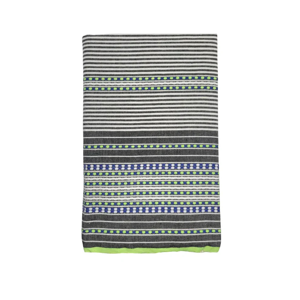 La fouta Senas allie raffinement et robustesse grâce à son tissage plat noir et blanc rayé d’un bord à l’autre, rehaussé d’une fine bande centrale et de broderies délicates vertes aux extrémités. Élégante et intemporelle, Senas est conçue pour vous suivre dans toutes vos aventures, du quotidien à l’évasion. Sa taille généreuse (1 x 2 m) en fait un accessoire polyvalent : serviette, paréo, jeté, nappe, châle ou couverture légère selon vos besoins. Confectionnée en coton 100 %, Senas est douce, absorbante et adaptée à toutes les peaux, même les plus sensibles. Résistante et facile d’entretien, la fouta Senas combine praticité et esthétisme pour une utilisation durable et stylée. Son design sobre et sa finition brodée en font une pièce aussi belle que fonctionnelle, idéale pour ceux qui recherchent un textile de qualité au charme discret et artisanal.